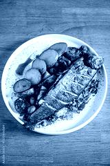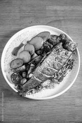 A beautifully arranged dish of grilled fish with crisp potatoes and vibrant vegetables