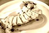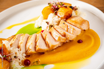 Grilled chicken sliced perfectly rests on creamy sauces accompanied by roasted vegetables