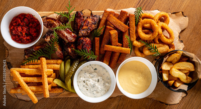 A tasty mix of crispy snacks, grilled meats, and dips served on a rustic wooden board