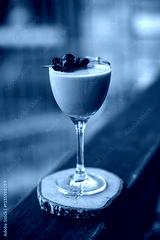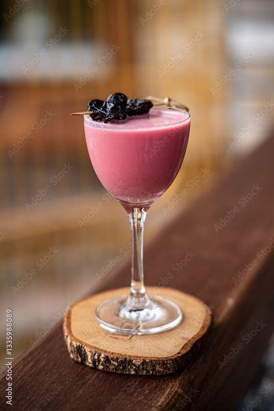 A charming pink cocktail in a stylish glass, garnished with dark fruits