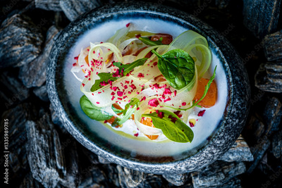 A delicate fennel salad stands out against a dark background, highlighting vibrant greens