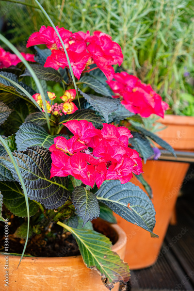 Vibrant pink blossoms thrive among lush green leaves, enhancing the garden's charm and beauty