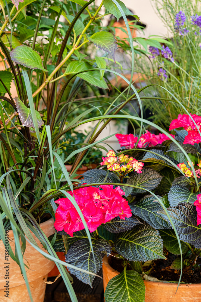 Bright pink blossoms complement delicate greenery in a tranquil garden setting, inviting peace