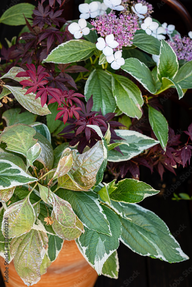 Lush greenery and colorful blooms create a stunning arrangement in a rustic pot, inviting serenity