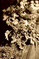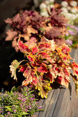 Colorful leaves and blossoms fill a rustic planter, showcasing nature's beauty in autumn light