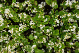 Delicate white flowers bloom amid lush green leaves in a tranquil spring garden