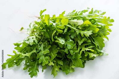 Crisp green arugula displayed with roots, perfect for enhancing any culinary creation with flavor