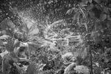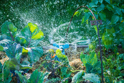 A garden thrives as a sprinkler showers colorful greens with refreshing water under bright sunlight