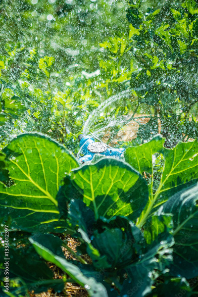 Green plants sway in the sun, with water droplets glistening on their leaves