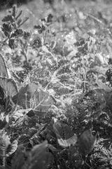 Water glistens on vibrant green leaves, showcasing a garden flourishing in midday sunlight