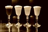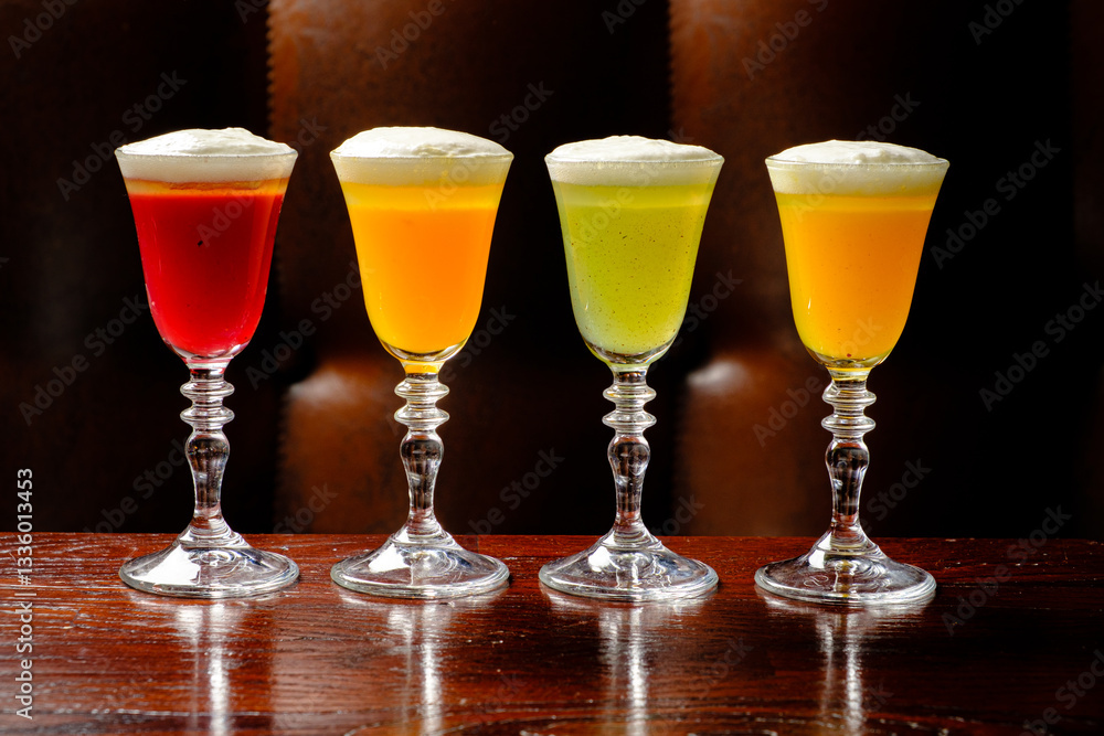 Four colorful cocktails on a polished wooden table invite patrons to indulge