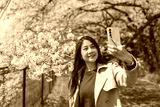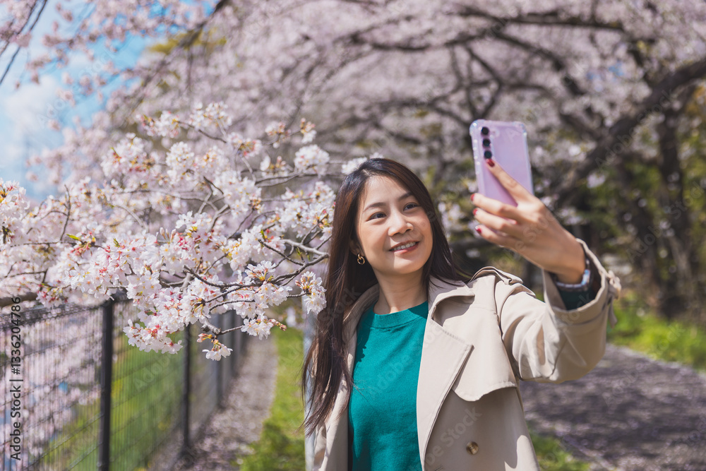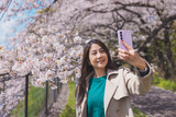 Traveler asian woman with mobile phone travel in sakura cherry blossom tree in Negawa Green Road Tachikawa Tokyo Japan in spring season