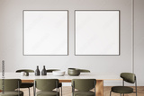 Minimalist dining room with two framed blank posters on light wall. 3D Rendering
