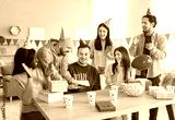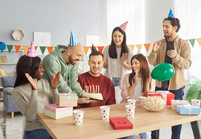 Happy diverse people congratulating smiling male friend sitting at festive table on birthday party at home. Young men and women gathering together celebrating holiday. Celebration concept.
