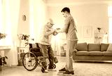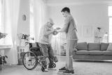 Portrait of a young male nurse helping a senior patient with disability to get off the wheelchair in retirement home. Physiotherapist or health care worker helping old disabled man in rehab.