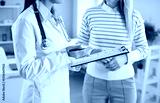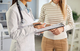 Cropped view of female doctor in white coat holding clipboard and pen, discussing medical results with patient. Woman in casual clothes listening attentively during consultation in modern clinic.