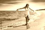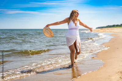 Beautiful middle-aged woman in swimsuit walking with outstretched arms on sandy beach in summertime. Energy and happiness. Front view