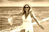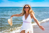 Summer vacations by sea. Beautiful elegant middle aged woman tourist walking along sea on sunny day. Front view