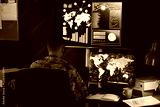 Soldier in uniform analyzing global data and information on multiple digital screens in a command center. Man sitting at desk focusing on important tasks, illuminated by screens