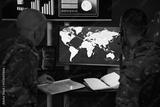 Soldiers analyzing global data on multiple screens in a control room with maps and charts visible on monitors while discussing information. Intense focus on strategic mission details
