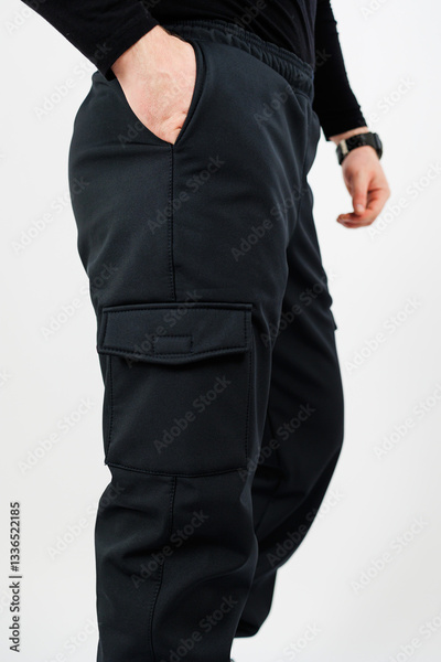 A man who is wearing black cargo pants has his hand casually in his pocket