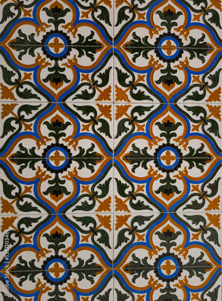 Seville style ceramic wall pattern, floral motifs, intricate geometric patterns