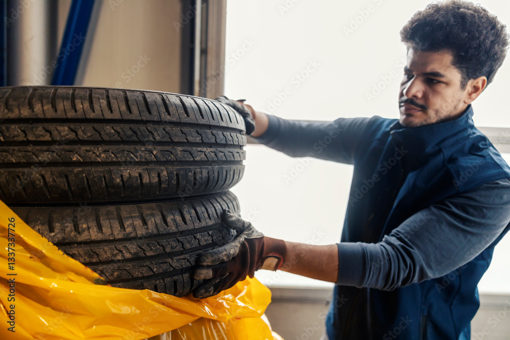 Multicultural mechanic putting spare tires on pile at mechanic workshop.
