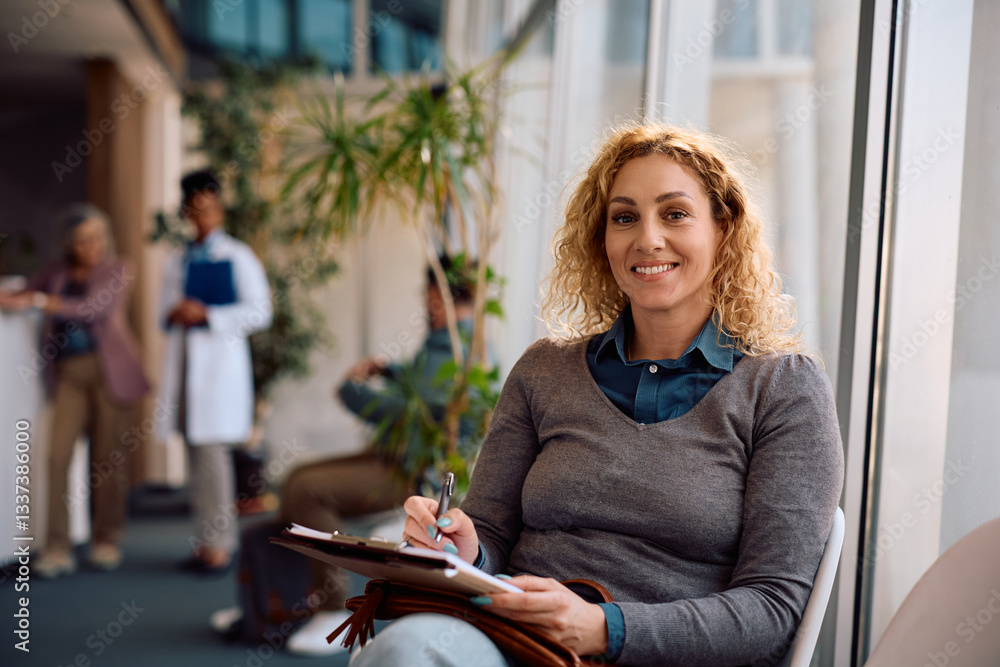 Happy woman filling out paperwork at doctor's office and looking at camera.