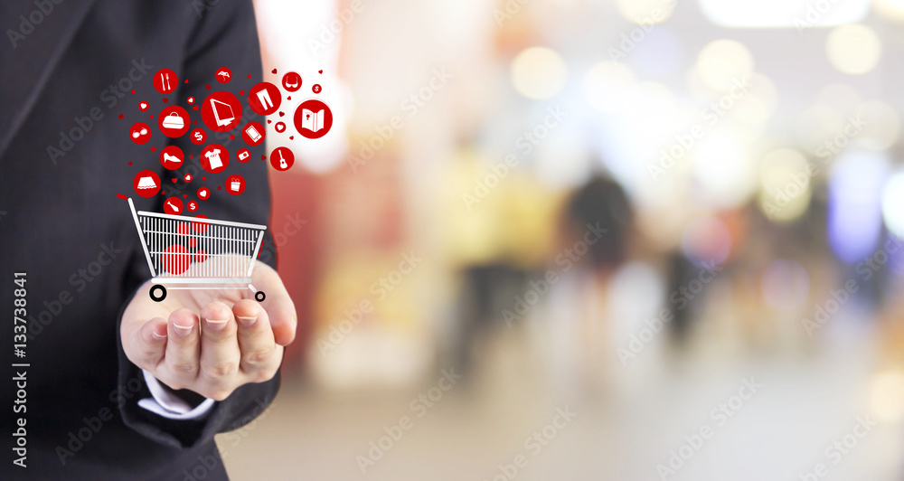 Online shopping concept of young business woman hand holding shopping cart with object icon design