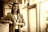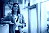 Portrait of smiling businesswoman at corporate office looking at camera.