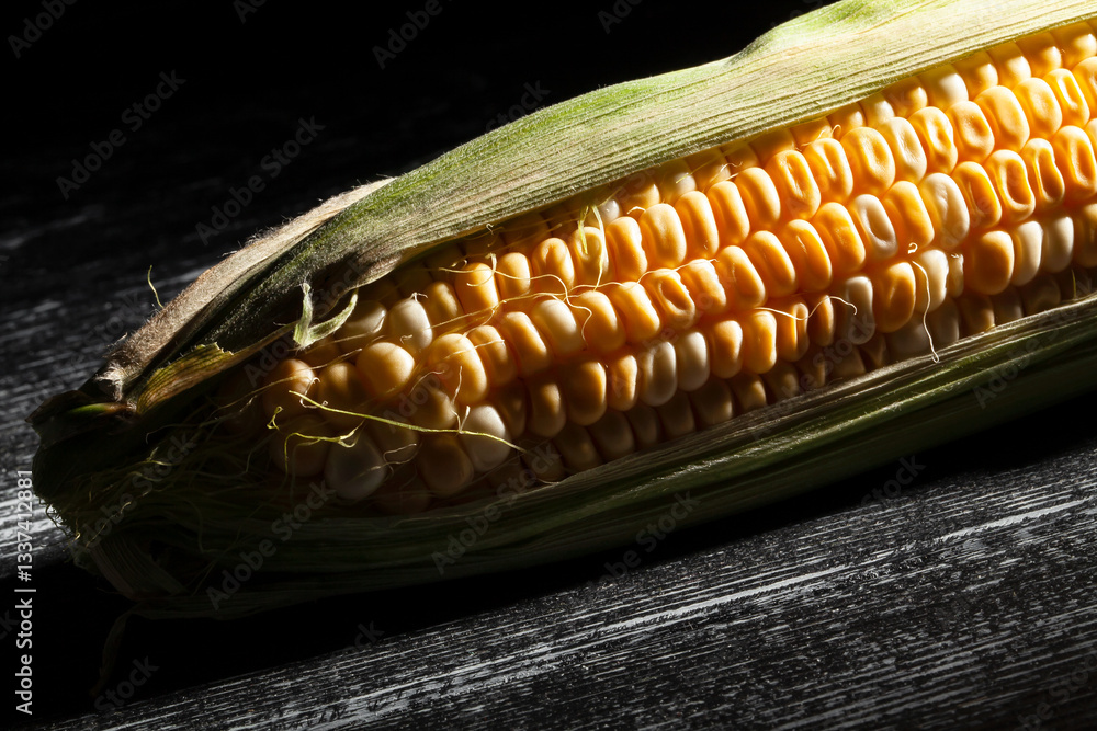 open corn on black wood background