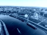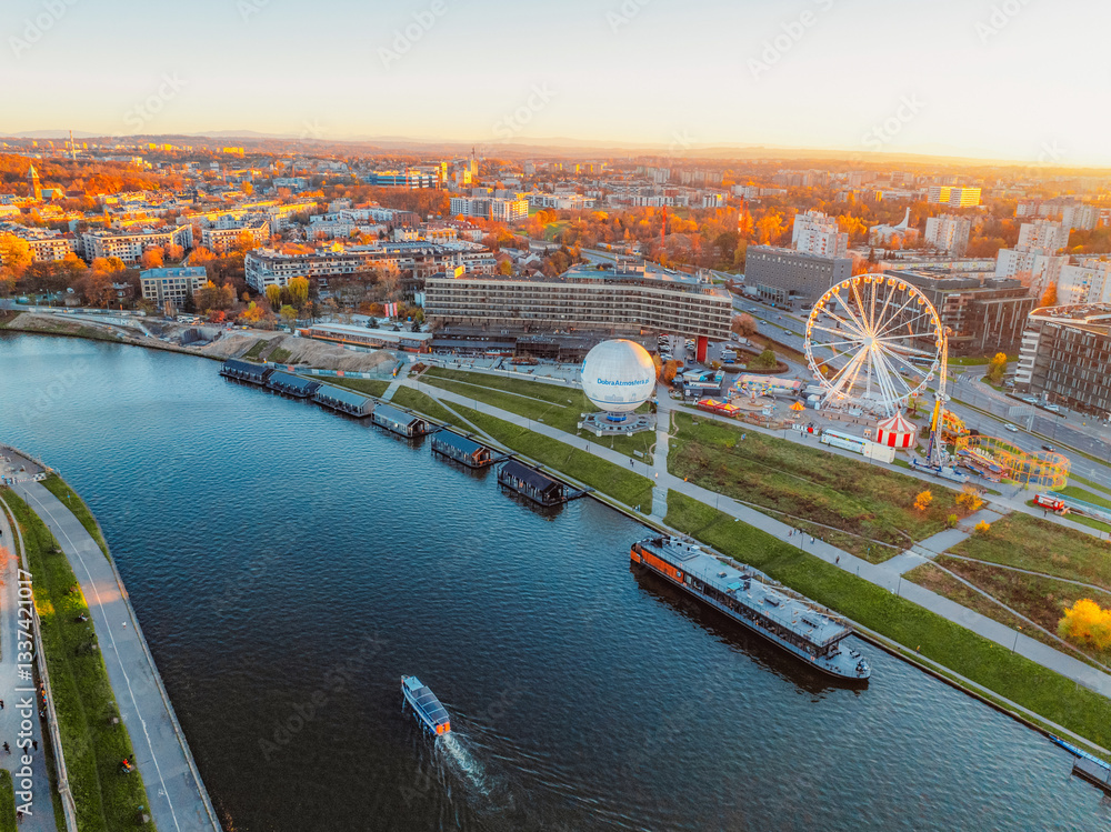 Wawel castle landmark with city view near river in Krakow Poland. Autumn landscape on coast river Wisla.
