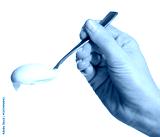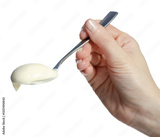 Hand holding spoon of yogurt on white background isolation