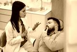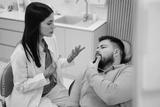 Dentist explaining diagnosis to patient having toothache in dental clinic
