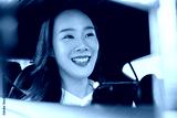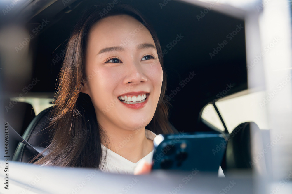 Smiling Asian woman is sitting in a private car and is holding a phone and looking outside.