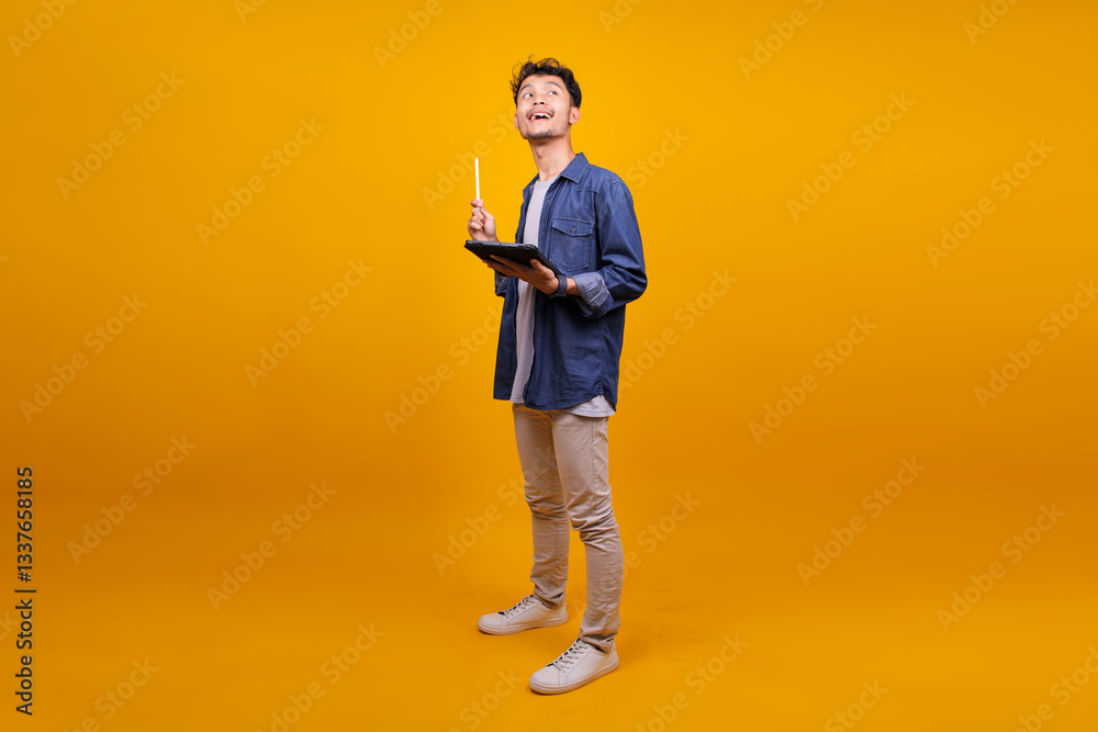 Positive Asian Man Experiencing AHA Moment Having Creative Idea Over Yellow Studio Background