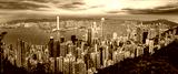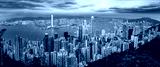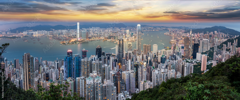High angle view of skyscrapers at dusk over the financial district in central Hong Kong, China. Asia tourist attraction. City skyline. Traffic and transportation.