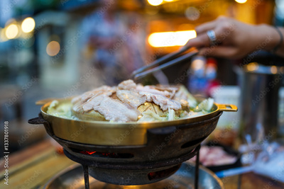 Person cooking on brass pan, Thai barbecue grill and vegetable. Selective focus
