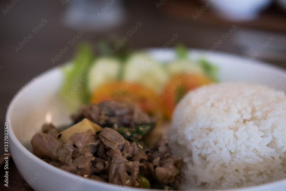 Delicious Asian stir-fried beef with rice and vegetables, served hot with, garlic, green peppers, capturing the essence of thai cuisine on a plate lunch, high protein meal