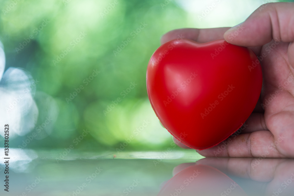 Man hands holding red heart over green nature lights background. Hand giving red heart, charity symbol.