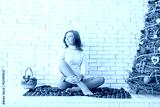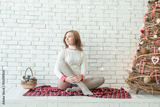 Beautiful pregnant woman sitting near the Christmas tree in the morning