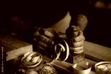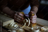 Plane jointer carpenter or joiner tool and wood shavings. Woodworking tools on wooden table. Carpentry workshop