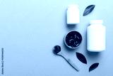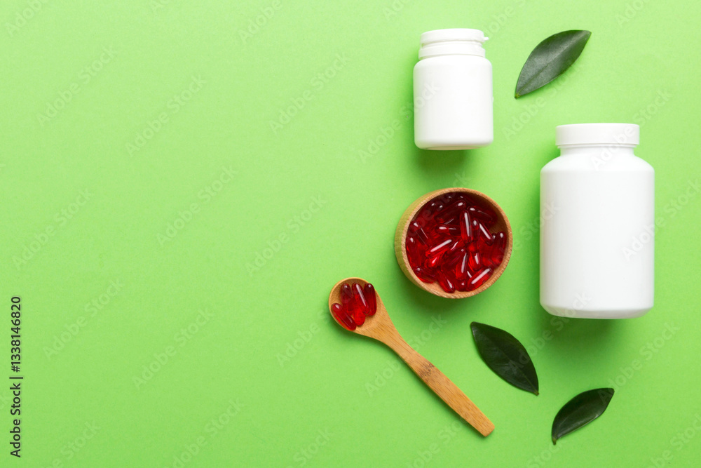 different drugs and health supplement pills with medicine bottle health care and medical top view. Vitamin tablets. Bottle with colored pills on table background. Multivitamins