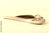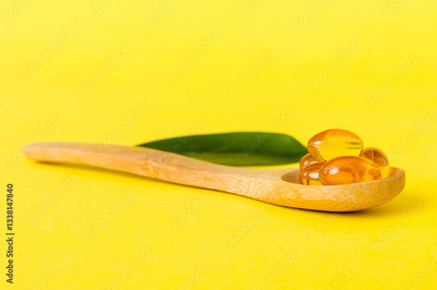 Vitamin omega capsules in a spoon on a colored background. Pills served as a healthy meal. Red soft gel vitamin supplement capsules on spoon