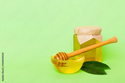 Honey in jar with leaves and honey dipper on colored background top view with copy text