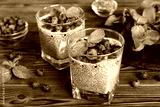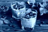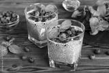 Healthy breakfast or morning with chia seeds vanilla pudding and blueberry berries on table background, vegetarian food, diet and health concept. Chia pudding with coconut milk and blueberry