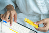 woman holding credit cards and he is choosing a credit card to pay and spend Payment for goods via credit card. Finance and banking concept