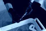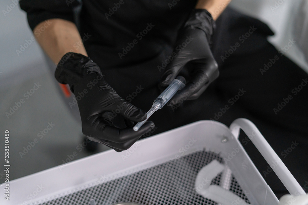 A professional cosmetologist wearing gloves and a mask carefully prepares a syringe filled with treatment solution in a contemporary beauty clinic, ready for patient application