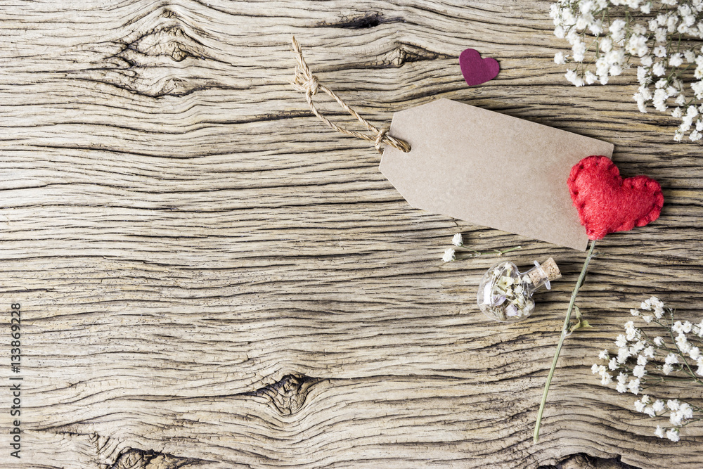 Love concept of blank brown paper tag with red heart and flowers on old wood for valentines day and wedding