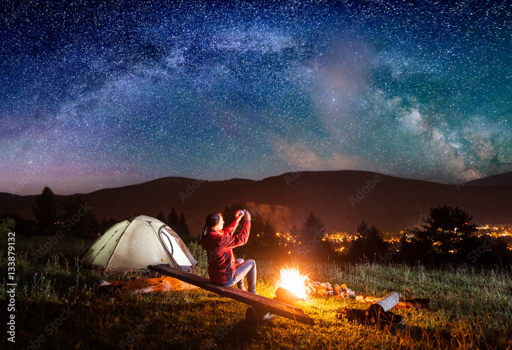 Hiker woman sitting on boards by a campfire near tent and makes the photo incredible view of night sky with stars and Milky way on the phone
